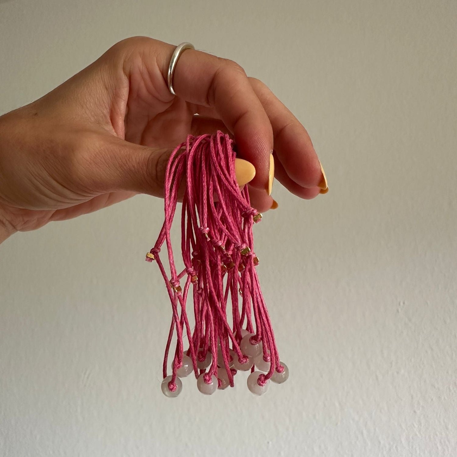 Zusammen mit dem pinken Garn ist das Bändchen nicht nur ein echter Hingucker, sondern auch eine kraftvolle Erinnerung im Alltag, gut für sich selbst zu sorgen.