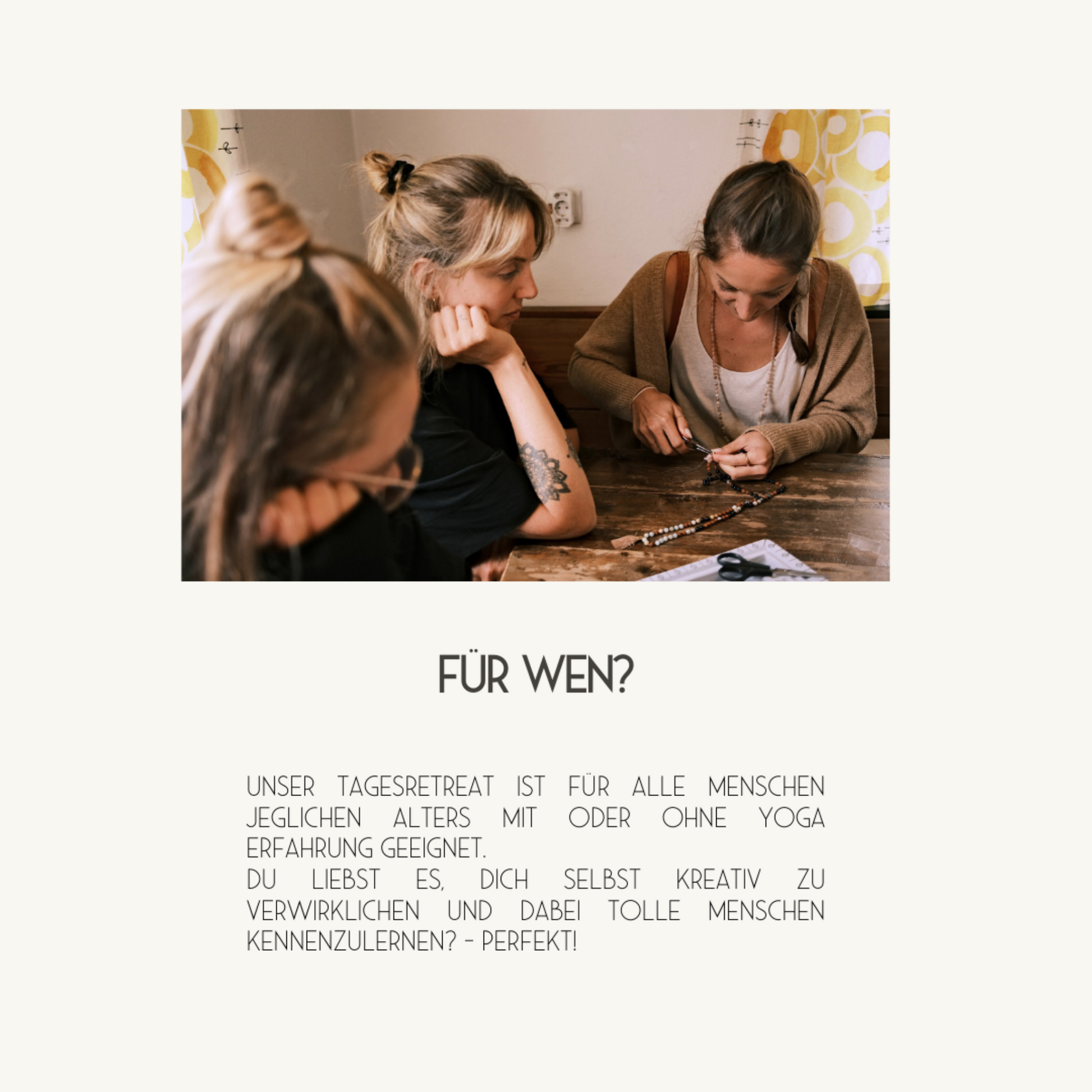 Von 10 bis 18 Uhr tauchst du in eine achtsame Auszeit ein – mit Yoga, Journaling, Meditation, Tee, Snacks und natürlich: dem Knüpfen deiner ganz persönlichen Mala aus echten Edelsteinen.