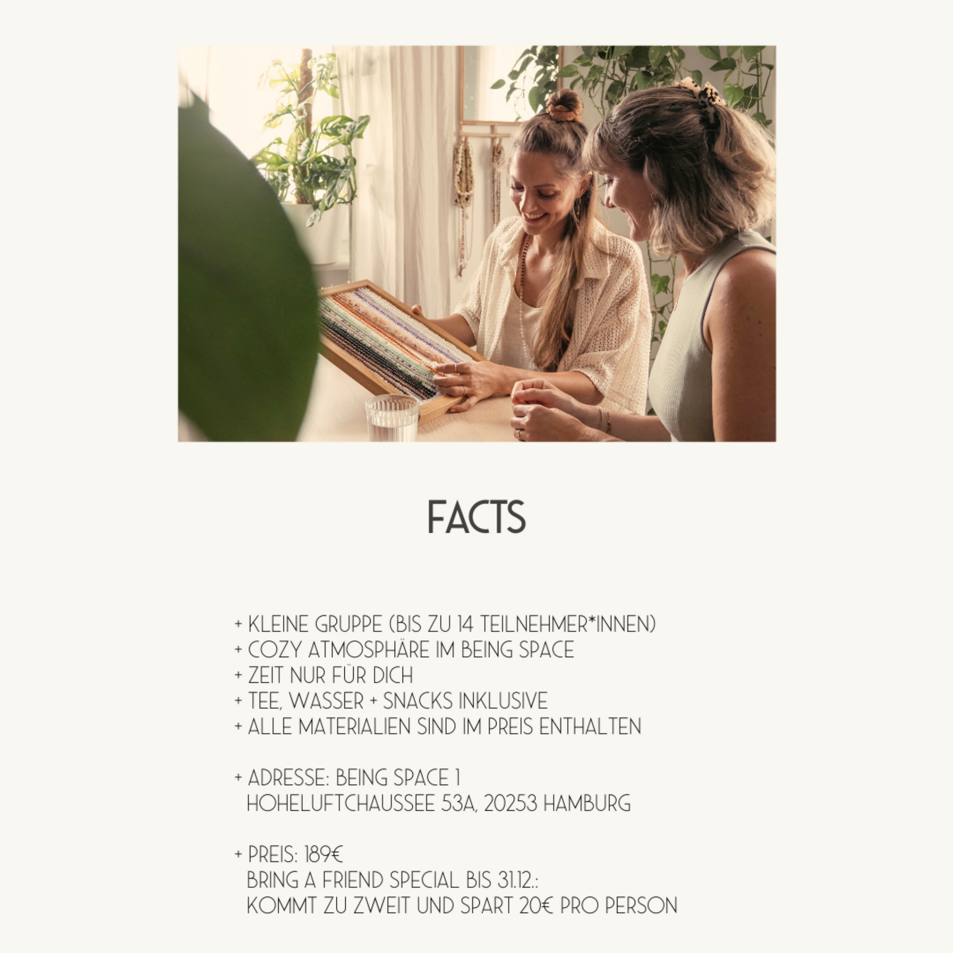Am Ende nimmst du nicht nur deine ganz persönliche handgeknüpfte Mala mit nach Hause, sondern auch ganz viel Inspiration, innere Ruhe und vielleicht ein neues Lieblingsritual für deinen Alltag. 💛
