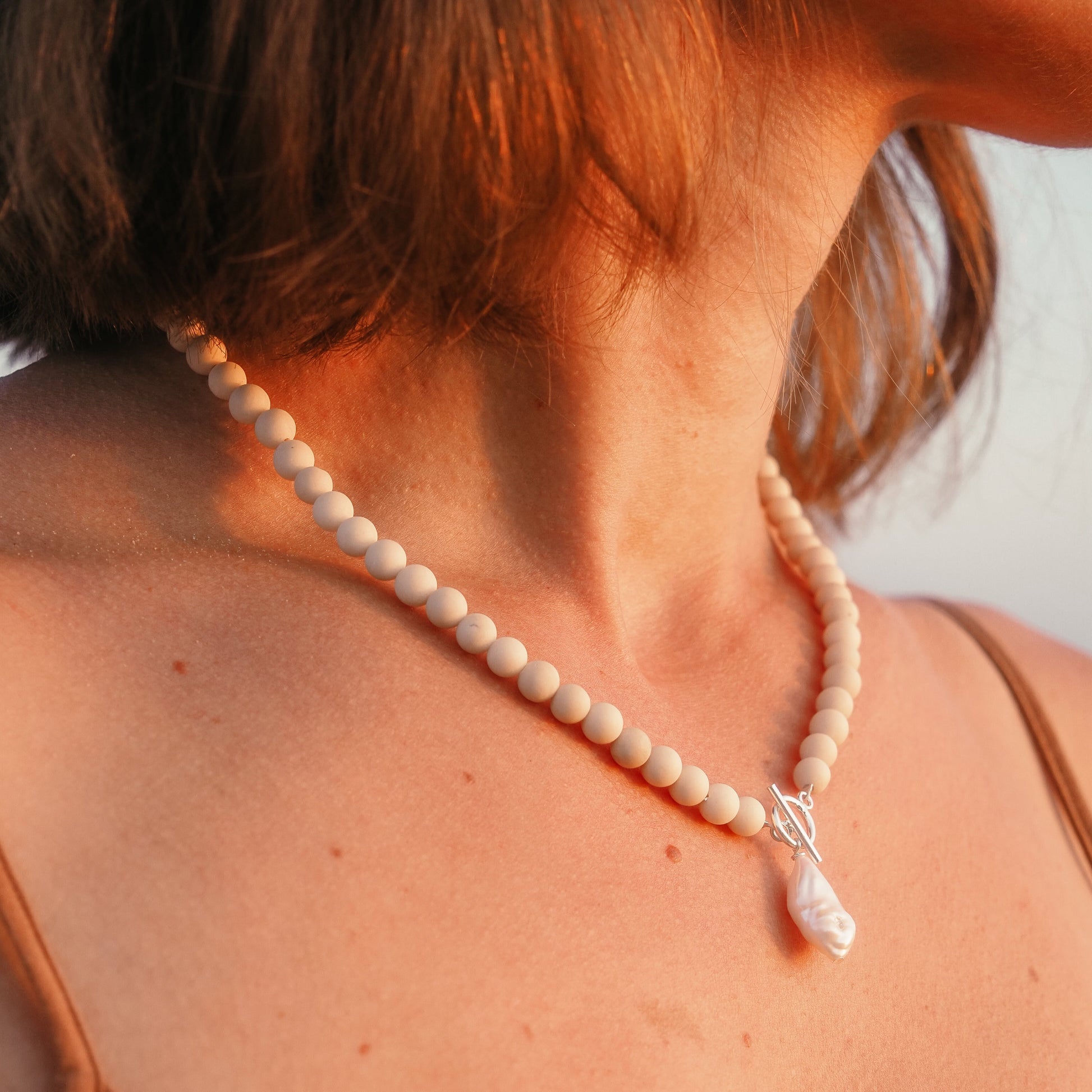 Gefertigt aus natürlichen Flusssteinen in 6mm und einer schimmernden Keshi Perle erzählt sie von sanftem Wasser, von Wärme auf der Haut, Sand unter den Füßen und von Momenten, in denen die Welt kurz innehält – und du einfach nur bist.
